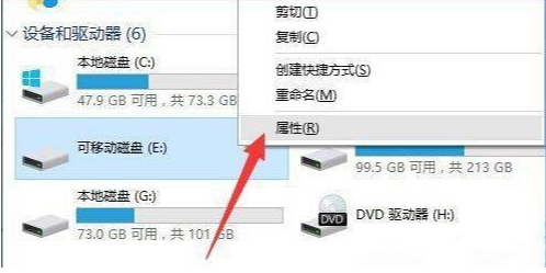 1、插入u盘,打开我的电脑,右击U盘盘符,在弹出的右键菜单中选择“属性”。