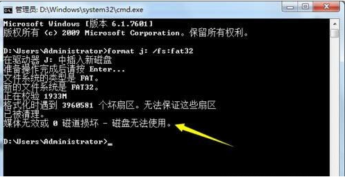 2、接着输入“format j: /fs:fat32”(其中j代表U盘所在盘符)并按回车键执行U盘格式化操作。