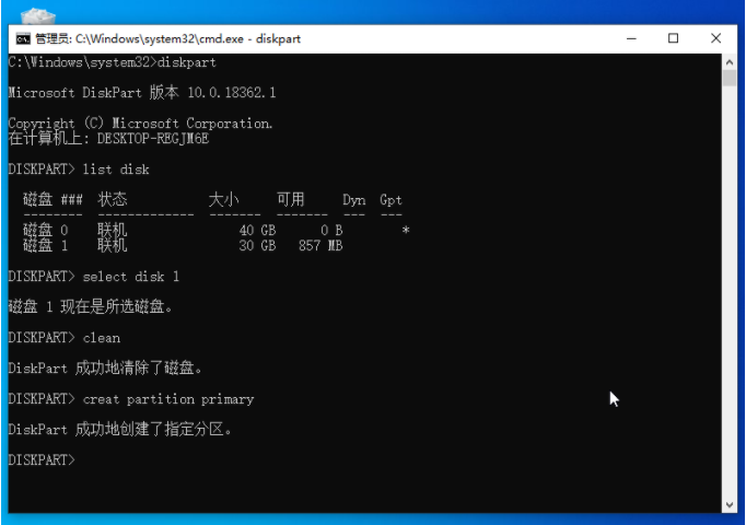 7、再输入并回车执行 creat partition primary 创建主分区命令;