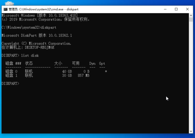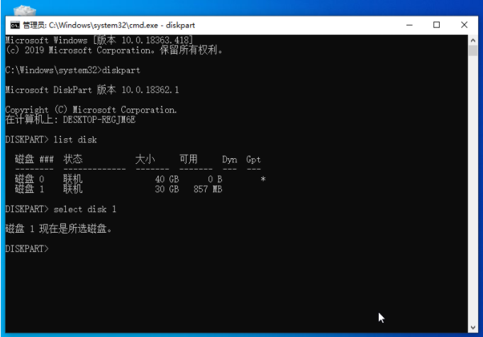 5、这里输入并回车执行 select disk 1 命令,也就是选择当前30GB大小的U盘;