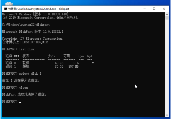 6、输入并回车执行 clean 命令,把当前U盘里的文件进行清除;