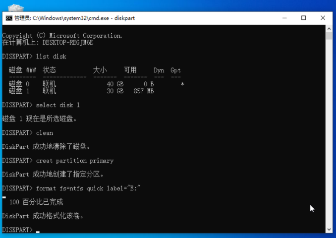 8、最后再输入并回车执行 format fs=ntfs quick label="E:" 对当前的E盘也就是U盘进行格式化即可;