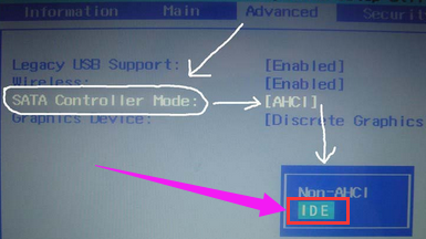 3、选中SATA那个选项,按回车后出来两个选项,选中AHCI 那个选项,将他切换为IDE就可以了。