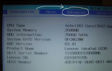 2、按F2进入BIOS,进入BIOS后,利用键盘上下左右键调整选项,然后选中Advanced。
