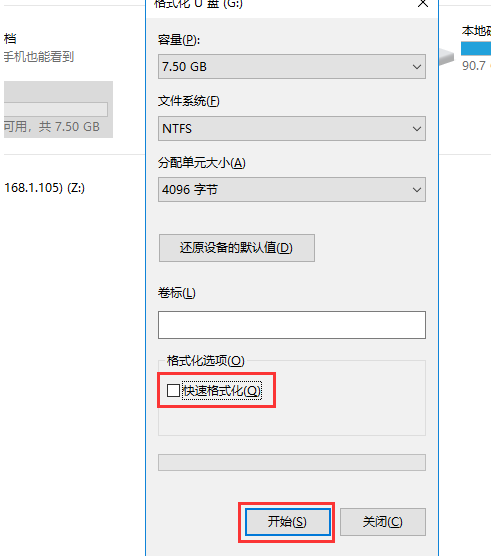 9、在弹出的窗口中取消勾选快速格式化,然后点击开始即可,待格式化完成即可。