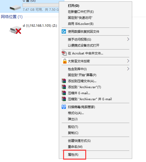 5、由于逻辑坏道导致的写保护。一般的逻辑坏道很好解决,在U盘盘符的上方点击右键,在弹出的窗口中点击属性;