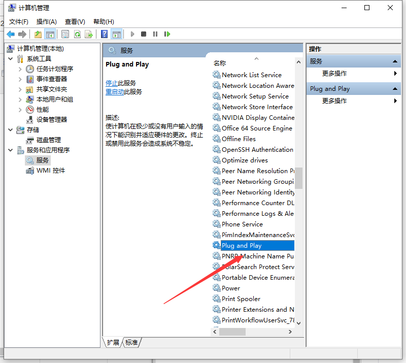3、在右边窗口中,找到“Plug and Play”服务,这个服务主要是能够识别并适应硬件的更改,双击打开它。
