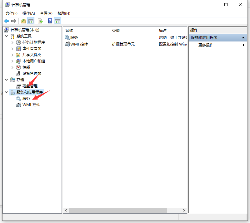 2、在左边窗口中点击“服务和应用程序”前面的三角图标,展开它。展开之后,单击里面的“服务”选项。