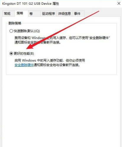 4、然后在打开的U盘属性窗口中点击“策略”的选项卡。