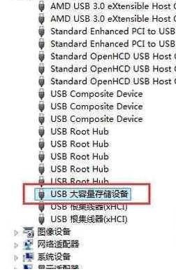 4、如果没有黄色感叹号,那我们也可以尝试鼠标右键点击USB大容量存储设备,然后点击卸载,然后我们再把U盘重新拔插一次,就能看到U盘了。