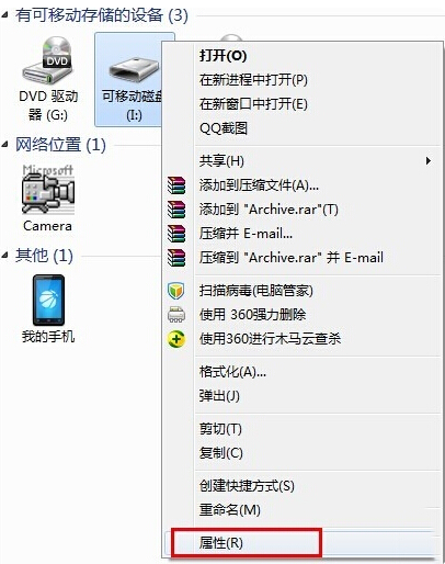 1、将鼠标移至有问题的u盘图标上,单击鼠标右键,在弹出的选项菜单中点击“属性”。
