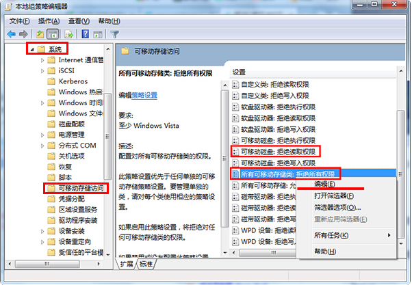 7、在打开的本地组策略编辑器窗口,依次点击“计算机配置——管理模块——系统——可移动存储访问”并在右侧中找到“可移动磁盘:拒绝读取权限”和“所有可移动磁盘:拒绝读取权限”单击右键点击“编辑”选项。