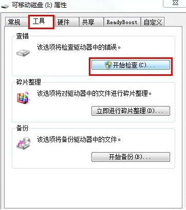 2、在弹出的属性窗口中点击“工具”选项卡,再点击“开始检查”按钮。