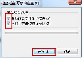 3、接着勾选“自动修复文件系统错误”和“扫描并尝试恢复坏扇区”并点击“开始”按钮。