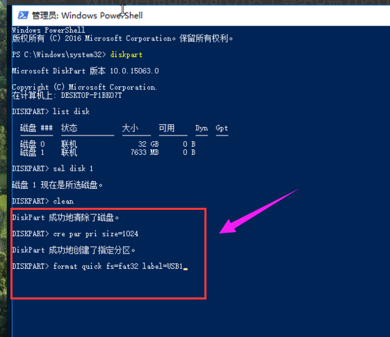 9、输入format quick fs=fat32 label=USB1,回车(fs是分区格式:fat32/exfat二选一,label是分区卷名随意可更改)